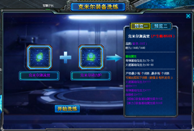 克米尔装备A和克米尔装备B进行洗练时,洗练产物C的装备类型一定是A或者B,不会出现其他类型。