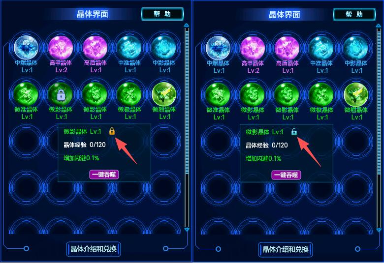 晶体锁:默认全部为未锁状态。点击即可锁定(解除锁定);锁定后,不能被吞噬和丢弃。